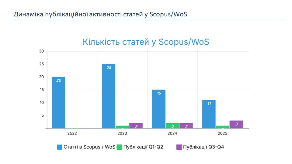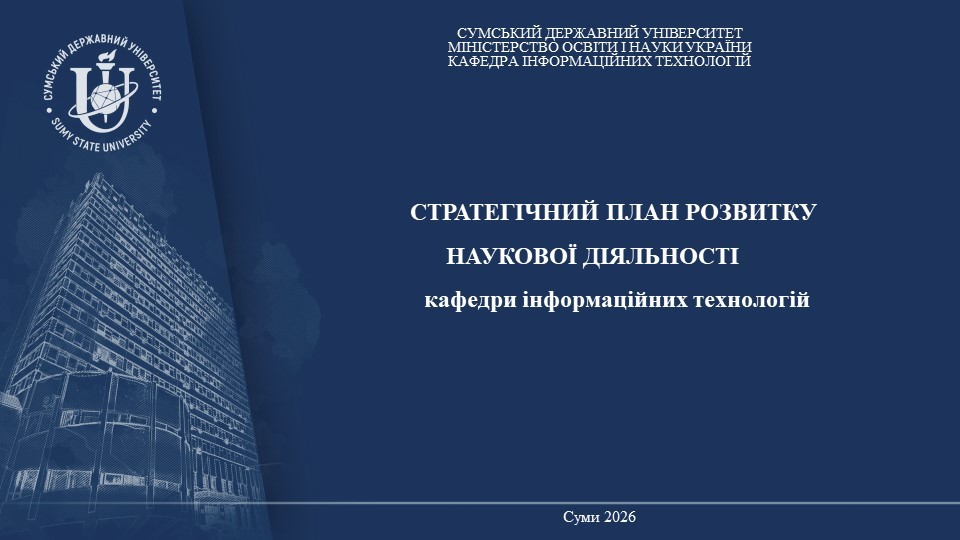 На кафедрі інформаційних технологій представлено Стратегію розвитку наукової діяльності на 2026–2030 роки, розроблену на основі аналізу результатів наукової роботи колективу за 2021–2025 роки. Документ визначає ключові пріоритети розвитку досліджень, підвищення публікаційної активності, розширення участі у національних та міжнародних наукових проєктах, а також активізацію залучення студентів і аспірантів до дослідницької роботи.