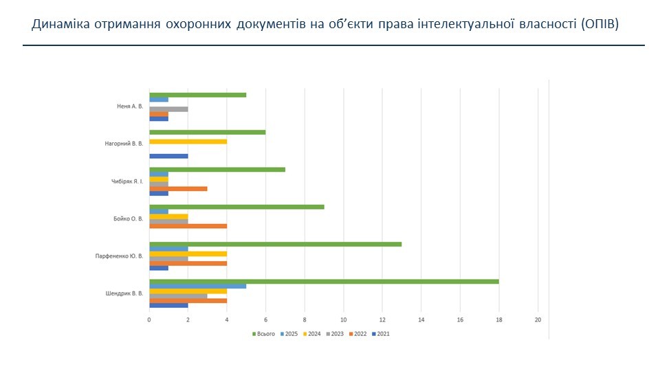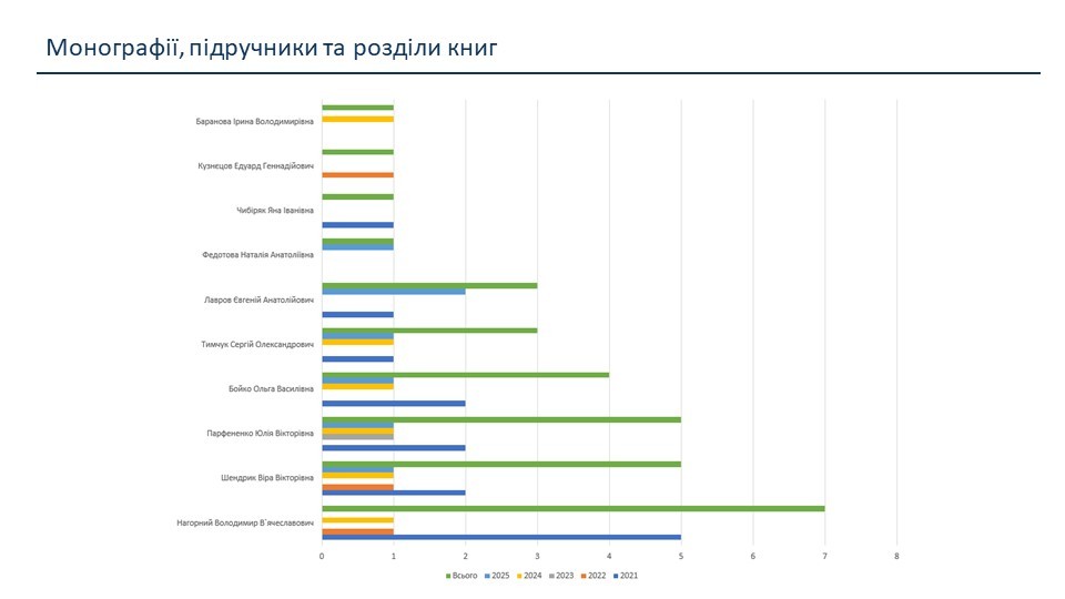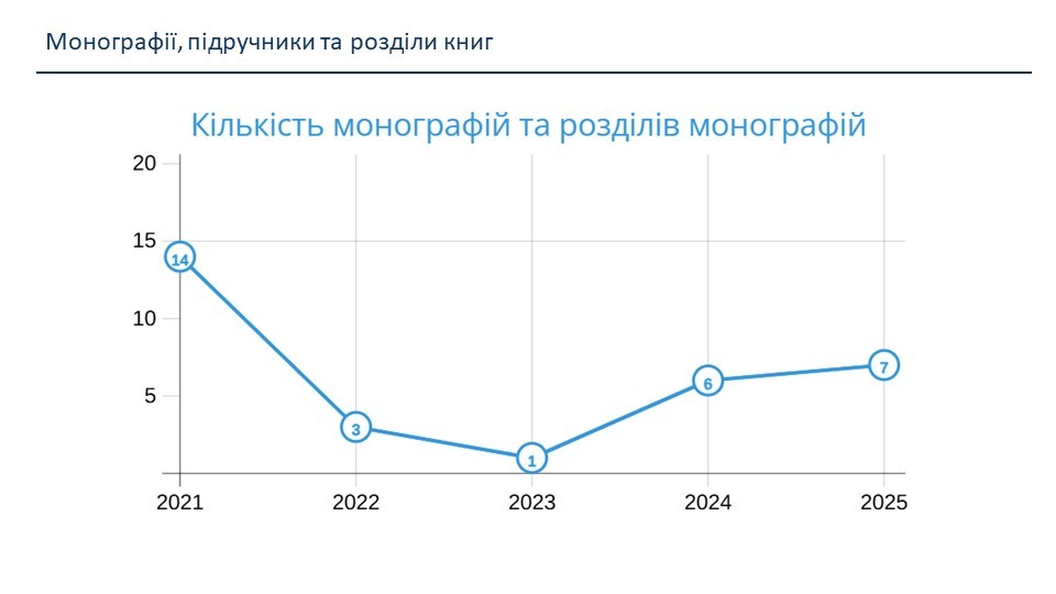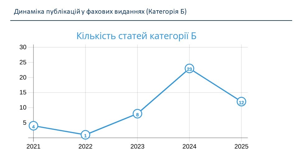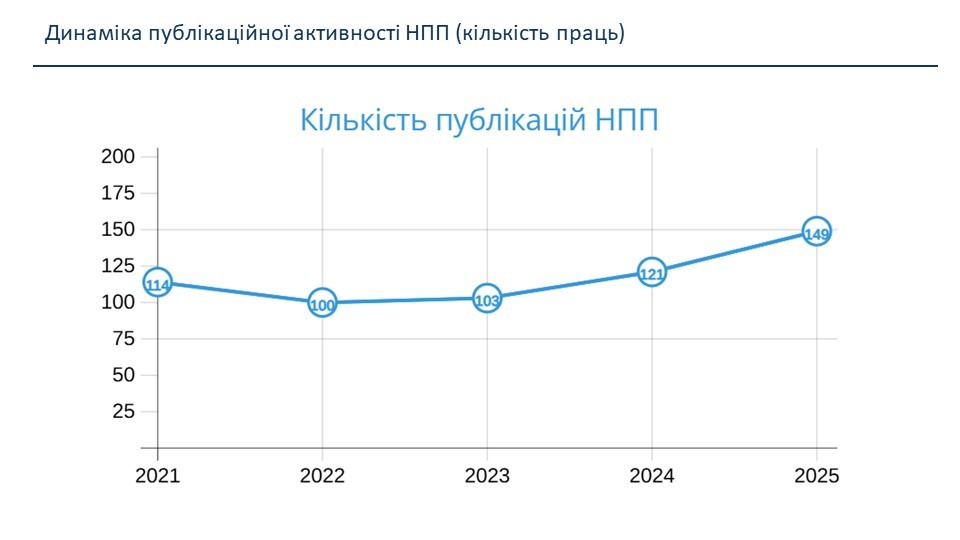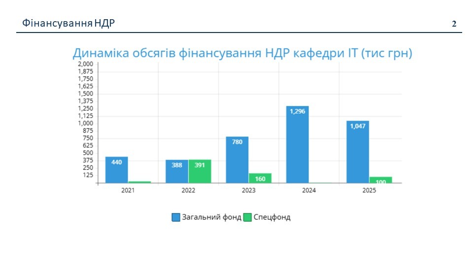 Проведений аналіз показників наукової діяльності засвідчив стабільне зростання наукової активності кафедри. Зокрема, протягом 2021–2025 років спостерігалося суттєве збільшення фінансування держбюджетних науково-дослідних робіт — з 464 тис. грн у 2021 році до 1147 тис. грн у 2025 році. У цей період на кафедрі виконувалися дві держбюджетні НДР під керівництвом професора Віри ШЕНДРИК, а у 2026 році розпочато нову НДР під керівництвом доцента Юлії ПАРФЕНЕНКО. Також у 2025 році виконувалася госпдоговірна наукова тема обсягом 100 тис. грн під керівництвом професора Сергія Тимчука.