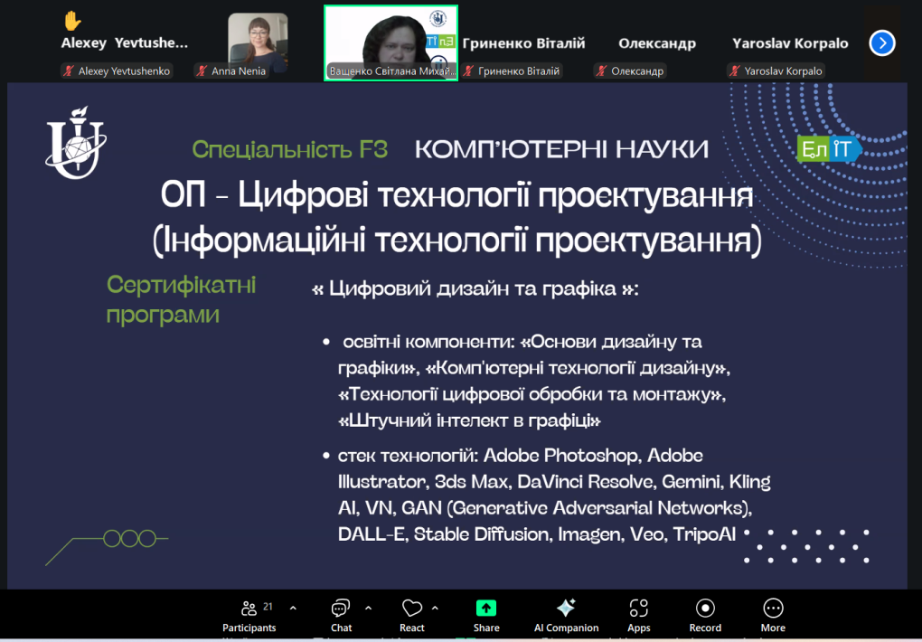 Освітню програму «Цифрові технології проектування» («Інформаційні технології проектування») (ОП), що реалізується на кафедрі інформаційних технологій, представляли завідувач кафедрою, к.т.н., доц. Неня А.В. та гарант освітньої програми, к.т.н., доц. Ващенко С.М.