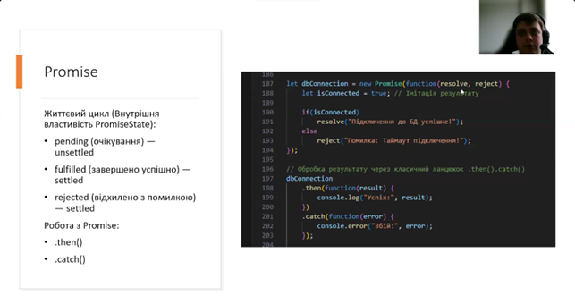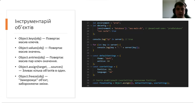 Під час лекції було розглянуто роботу з об’єктами JavaScript, зокрема їхні типи та особливості використання, принципи спадкування, статичні властивості та методи. Окрему увагу приділено механізмам повторного використання коду за допомогою mixin, роботі з promise та асинхронному програмуванню із застосуванням async/await, а також особливостям циклу обробки подій у JavaScript.